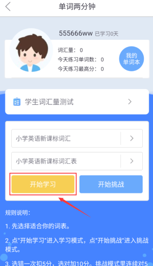 4、點(diǎn)擊紅框開(kāi)始學(xué)習(xí),選擇詞表進(jìn)行練習(xí)。