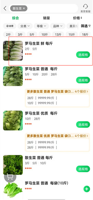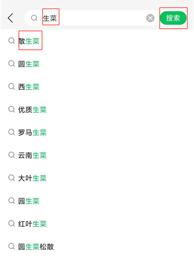 3、如填寫上【生菜】字樣,點擊右側(cè)的搜索按鈕,將可以看見各種不同的蔬菜,可以點擊第一個【散生菜】;