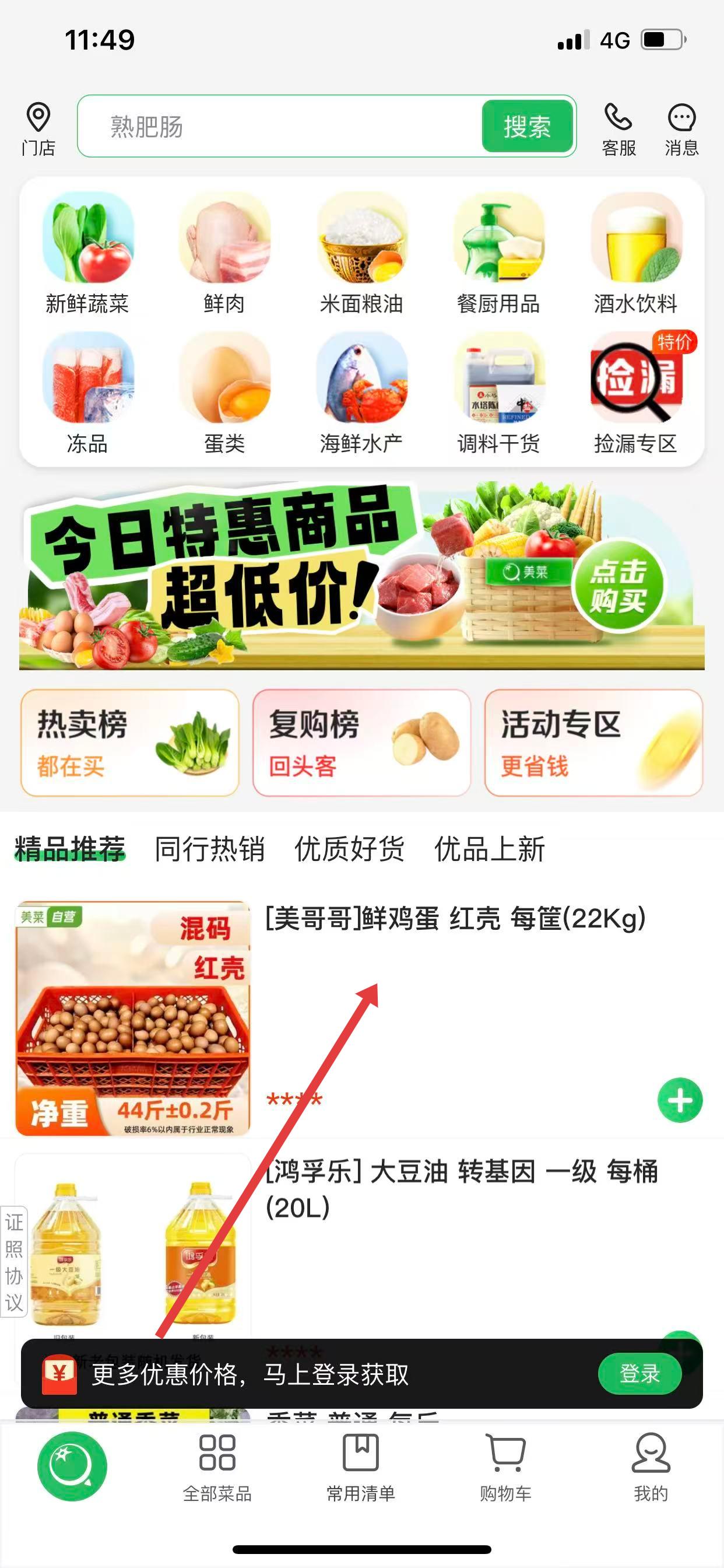 1、打開美菜商城APP,在首頁瀏覽各類菜品分類,找到想買的菜品,進(jìn)入商品詳情頁。
