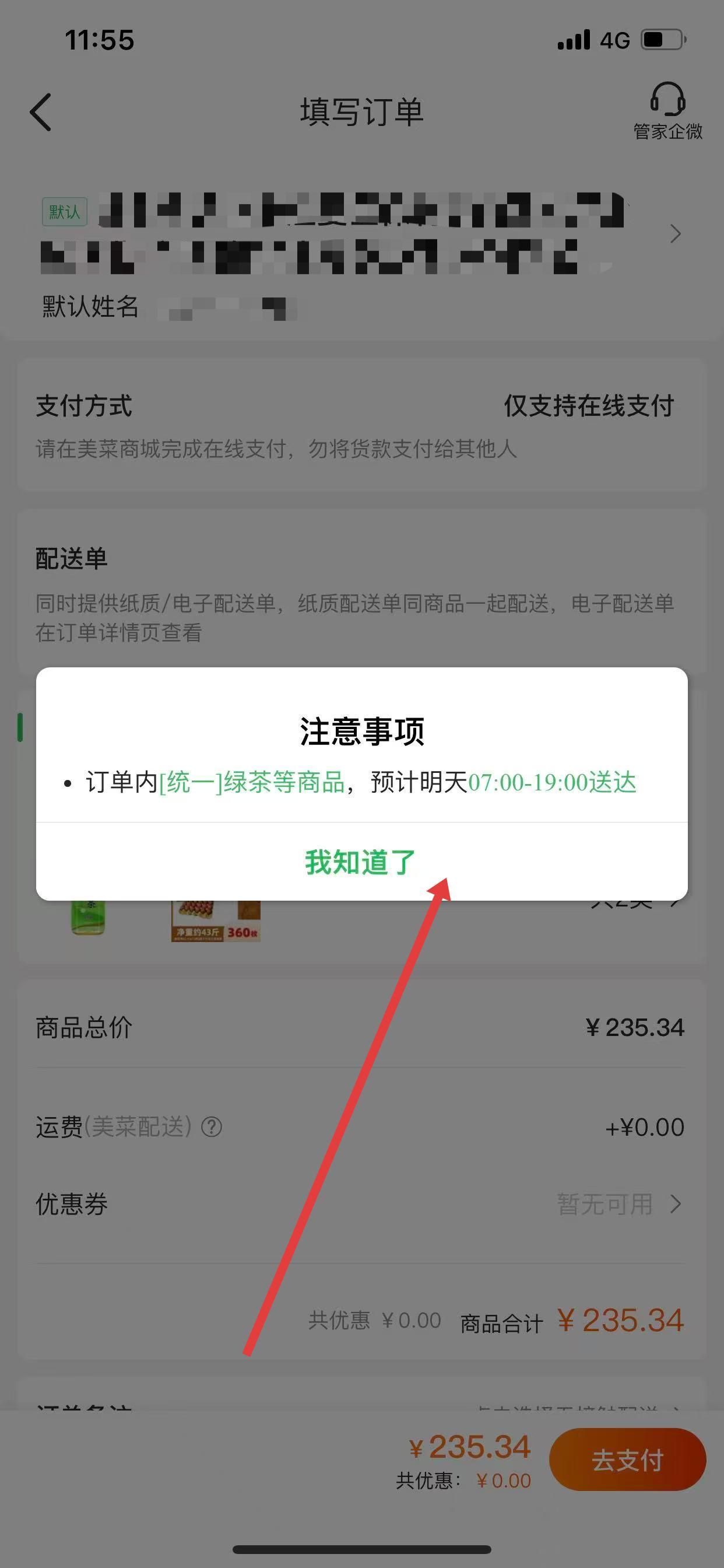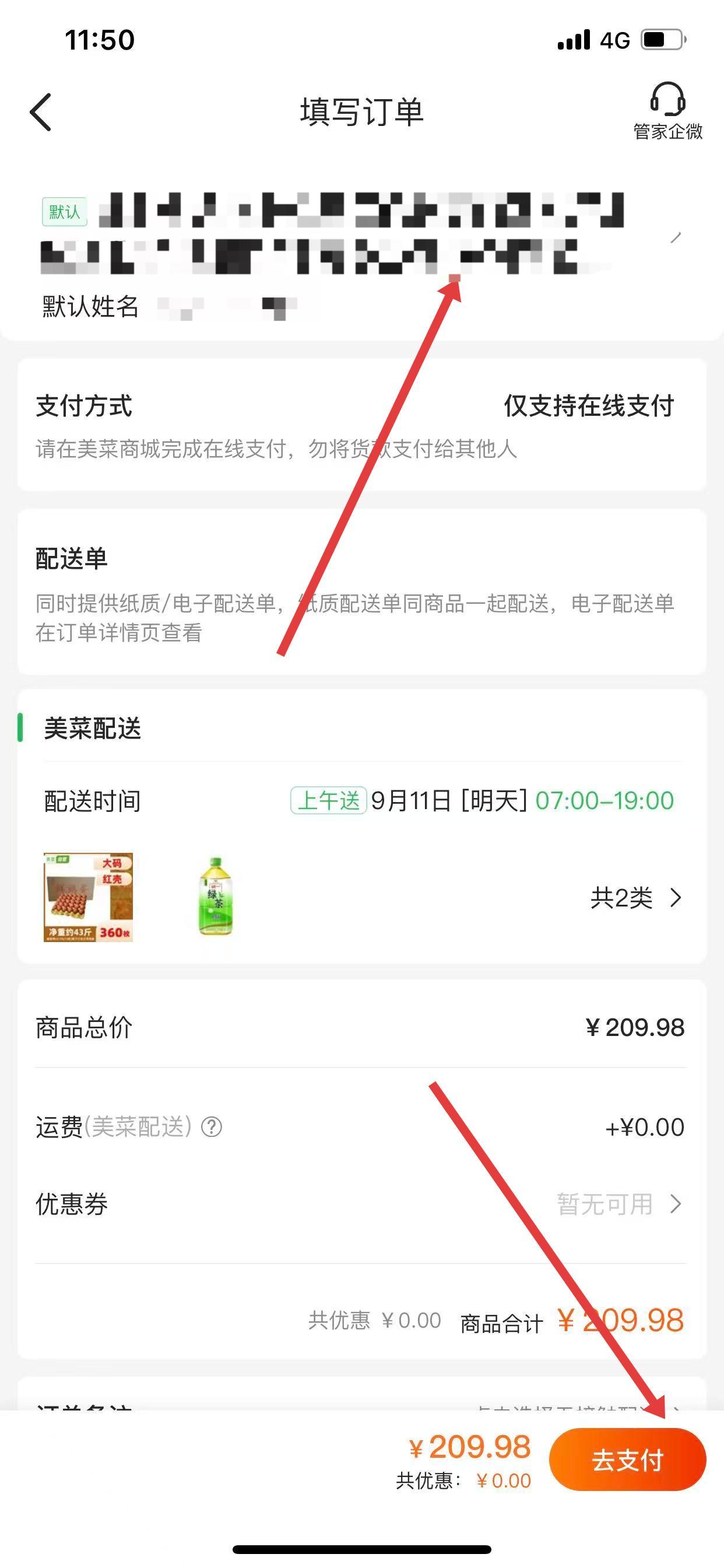 4、在填寫訂單頁面,確認(rèn)收貨地址、配送時間、商品總價等信息無誤后,點擊去支付。