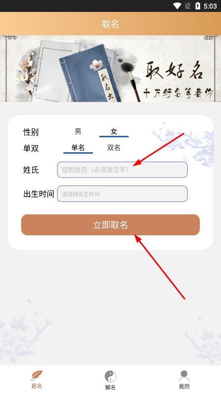 2、進(jìn)入取名頁(yè),選性別、單雙名,填姓氏、出生時(shí)間,點(diǎn)立即取名,獲推薦名字。