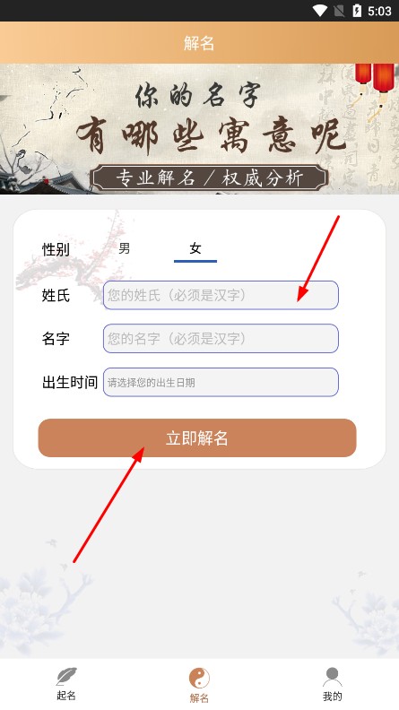 3、切換到解名頁(yè),填姓氏、名字、出生時(shí)間,點(diǎn)立即解名,了解名字寓意。