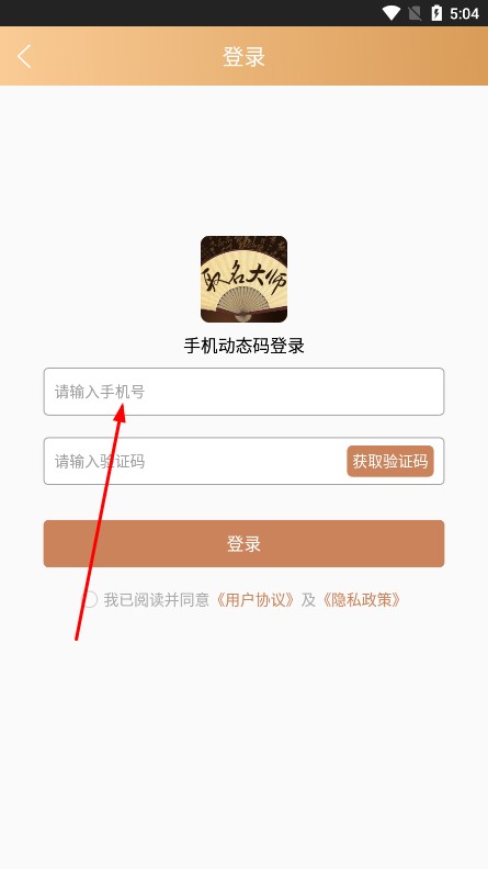 1、打開(kāi)取名大師,用手機(jī)動(dòng)態(tài)碼登錄,輸入手機(jī)號(hào)、驗(yàn)證碼完成登錄。