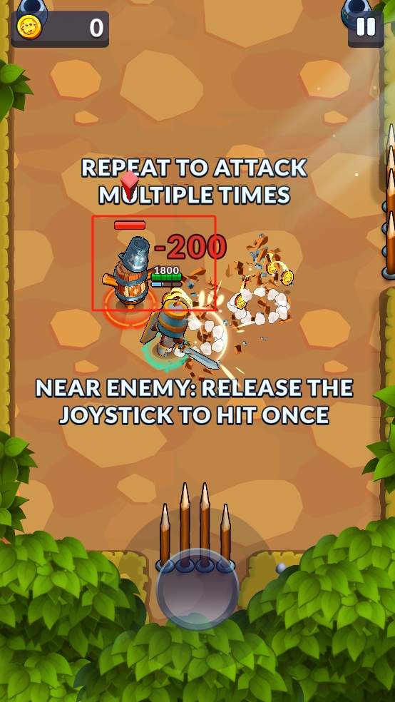 2、靠近敵人時(shí),松開搖桿可攻擊一次,重復(fù)操作能多次攻擊,擊敗敵人獲取金幣,同時(shí)注意躲避陷阱。