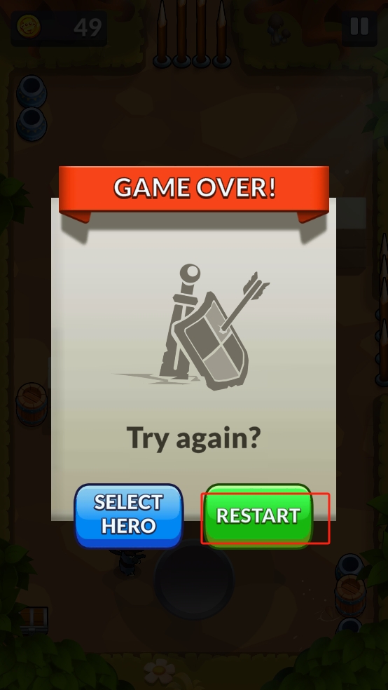 3、若游戲失敗,出現(xiàn)GAME OVER界面時(shí),我們可以點(diǎn)擊綠色的RESTART按鈕重新開始游戲,繼續(xù)挑戰(zhàn)。