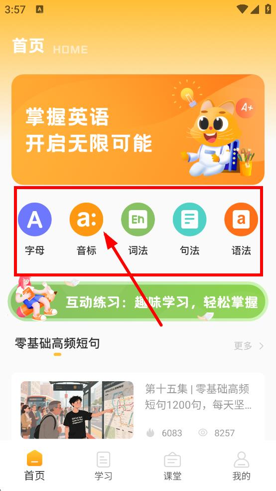 1、在首頁,點擊音標(biāo)選項,進入音標(biāo)學(xué)習(xí)頁面。