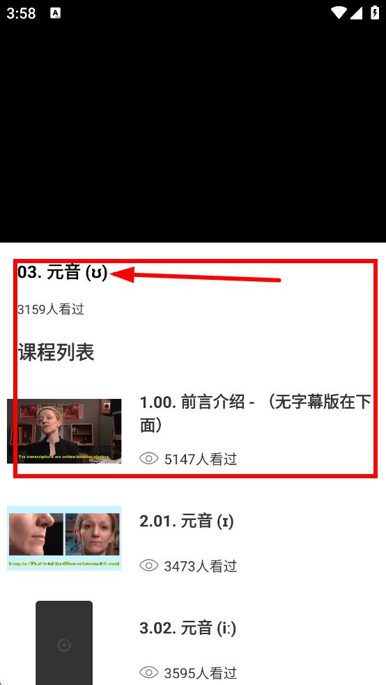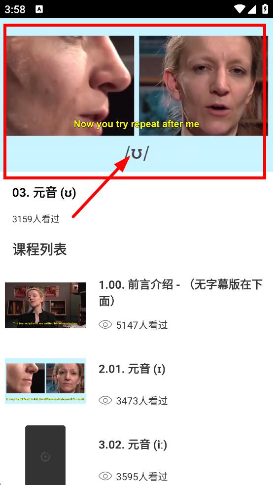 3、進入03.元音課程頁面,可觀看視頻學(xué)習(xí)元音u的發(fā)音。