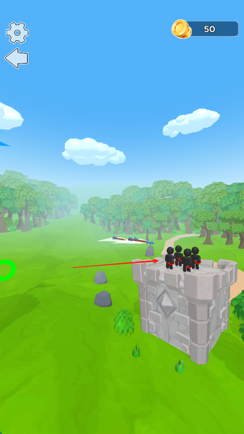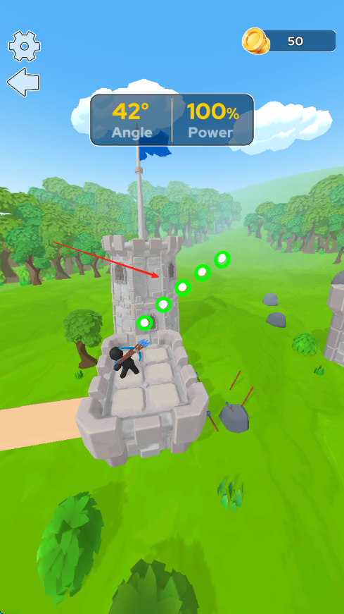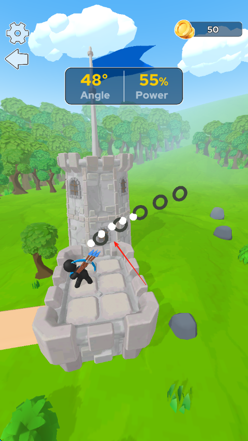 2、發(fā)現(xiàn)敵方目標后,調整角度和力度,按箭頭指引發(fā)射弓箭,嘗試擊中敵人。