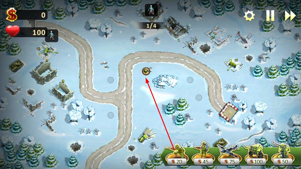 1、進入關(guān)卡,在道路空位布置士兵等防御塔,搭建初始防御陣線。