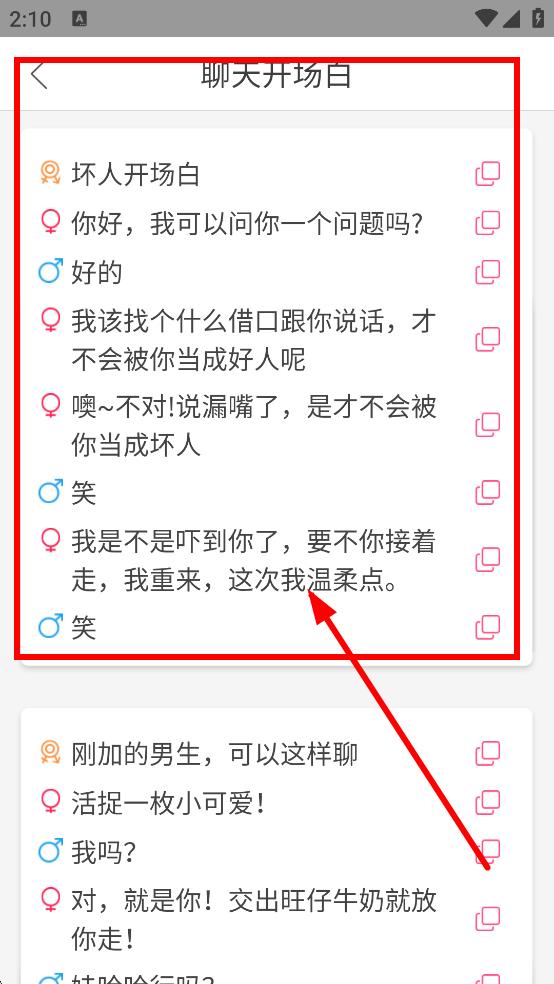 1、海量話術(shù)分類匯集:整合海量戀愛話術(shù)庫資源,涵蓋土味情話、戀愛術(shù)語等類型,按類別精準篩選,快速定位所需內(nèi)容,無需花費大量時間查找。