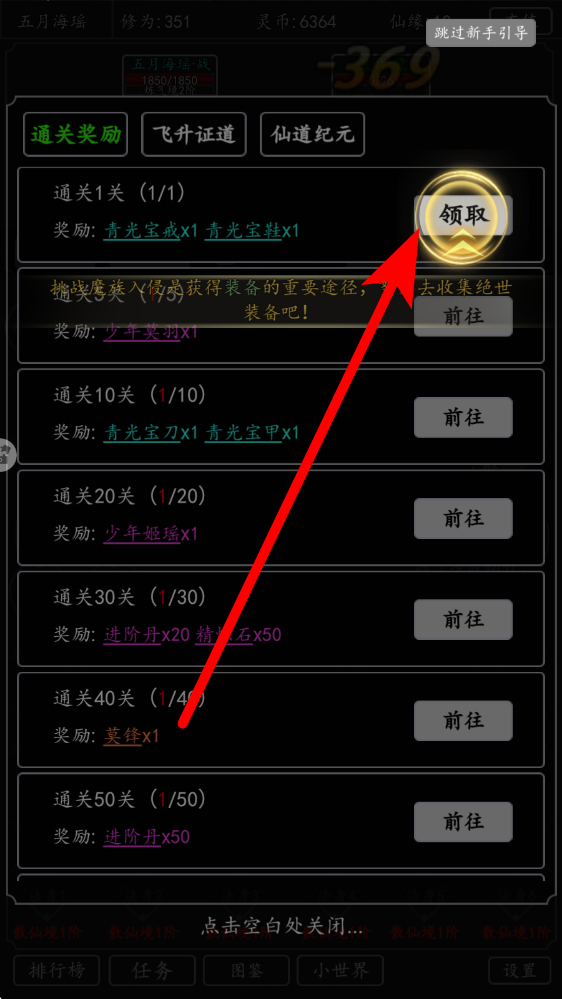 3、通關(guān)領(lǐng)獎(jiǎng)通關(guān)關(guān)卡后,進(jìn)入獎(jiǎng)勵(lì)界面點(diǎn)擊領(lǐng)取,獲取青光寶戒、青光寶鞋等裝備或道具,強(qiáng)化角色戰(zhàn)力,為修真之路添助力。