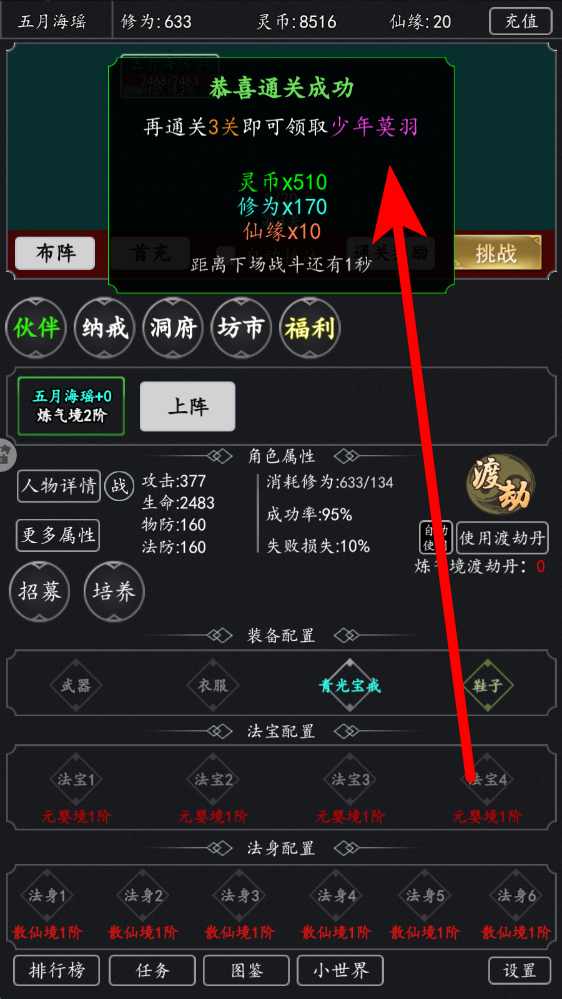 1、渡劫提升點(diǎn)擊界面渡劫按鈕,消耗修為嘗試突破,成功率達(dá)標(biāo)時(shí)完成境界提升,每突破大境界,角色實(shí)力大幅增強(qiáng),助力后續(xù)挑戰(zhàn)。