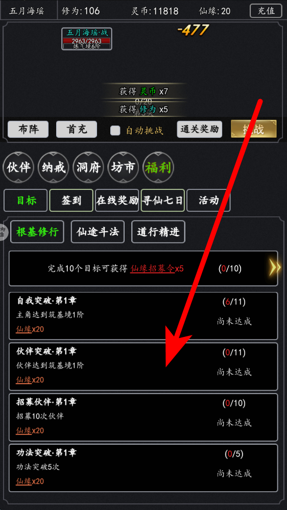2、福利任務(wù)進(jìn)入福利板塊,完成伙伴突破第1章等目標(biāo)任務(wù),達(dá)成條件可獲仙緣招募令、仙緣等獎(jiǎng)勵(lì),推動(dòng)角色與伙伴養(yǎng)成進(jìn)度。