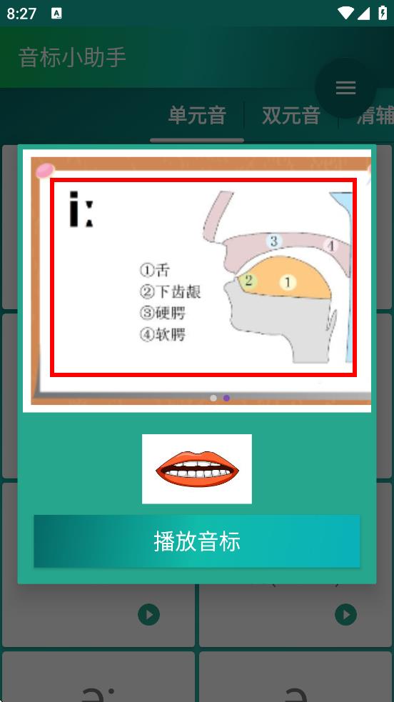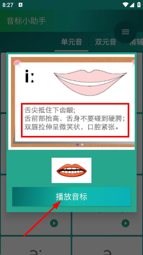 2、彈出的音標(biāo)發(fā)音指導(dǎo),查看發(fā)音嘴型等文字說明,點(diǎn)播放音標(biāo),可聽音標(biāo)發(fā)音。