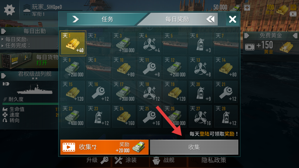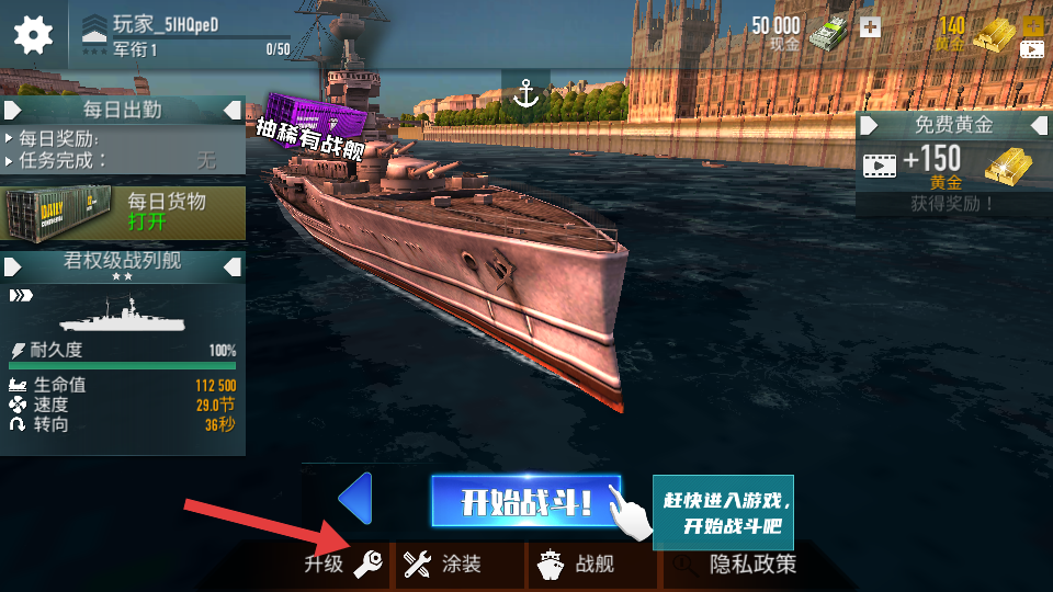 1、進(jìn)入游戲后先解鎖基礎(chǔ)戰(zhàn)艦,在戰(zhàn)艦工坊查看初始戰(zhàn)艦的屬性短板,通過完成新手引導(dǎo)任務(wù)獲取首批升級(jí)材料,為后續(xù)升級(jí)做好準(zhǔn)備。