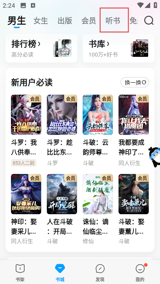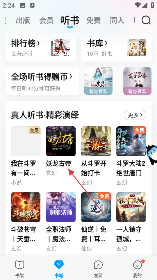 1、點(diǎn)擊頂部聽(tīng)書(shū),進(jìn)入聽(tīng)書(shū)頁(yè)面。