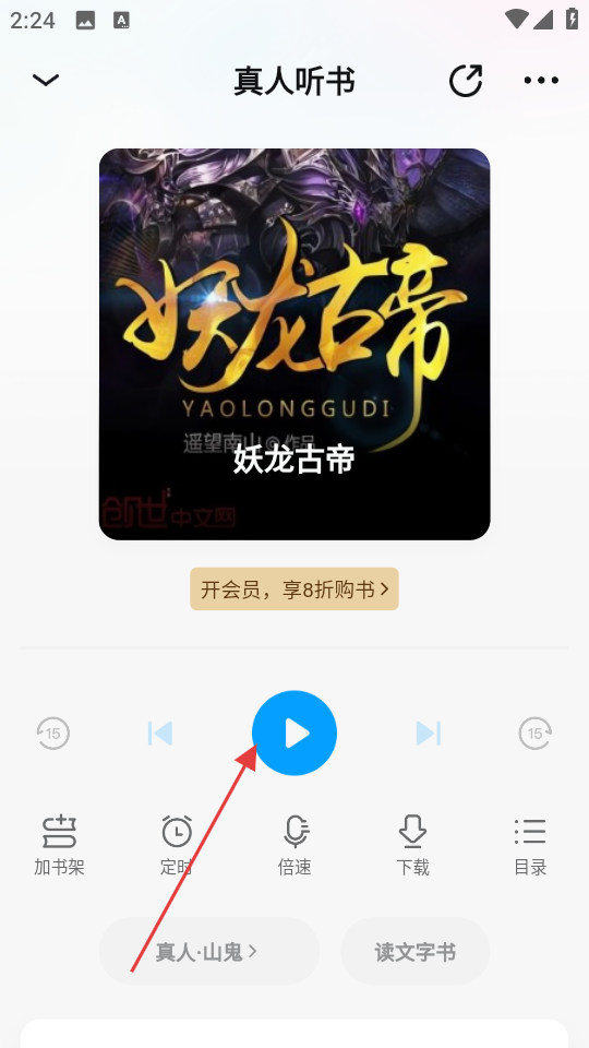 3、在妖龍古帝聽(tīng)書(shū)頁(yè),點(diǎn)擊播放按鈕,開(kāi)始聽(tīng)書(shū)。