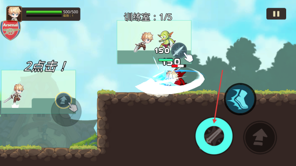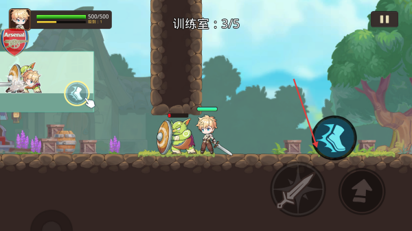 1、進入游戲查看左上角角色血量和波數(shù)信息,點擊右下角類似鞋子的按鈕控制角色移動,熟悉操作。