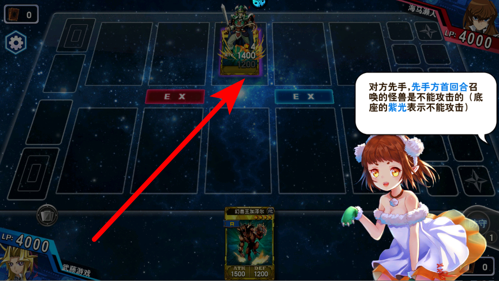 1、對戰(zhàn)開始時,留意對手先手召喚的怪獸,若怪獸底座有紫光,代表其首回合不能攻擊,可據(jù)此判斷對手首輪攻擊威脅,制定應(yīng)對策略。