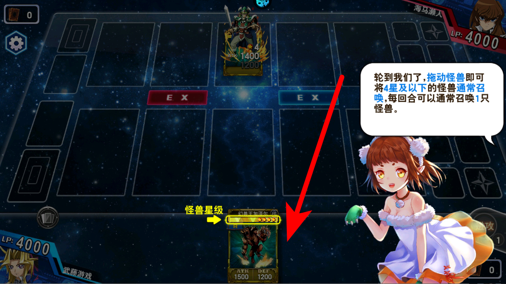 2、輪到自己回合,拖動4星及以下的怪獸進行通常召喚,每回合通常召喚數(shù)量為1只,根據(jù)手牌中的怪獸卡牌,選擇合適召喚到場上,構(gòu)建己方戰(zhàn)力。