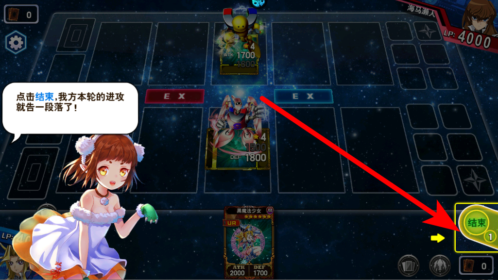 3、完成怪獸召喚等操作后,點擊結(jié)束按鈕,即可結(jié)束己方本輪的進攻階段,進入對手回合,等待對手行動,同時觀察場上局勢變化。