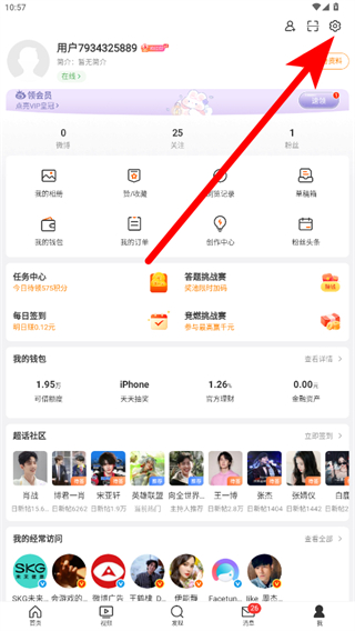 2.在個(gè)人主頁(yè)界面,點(diǎn)擊右上角的設(shè)置圖標(biāo)。