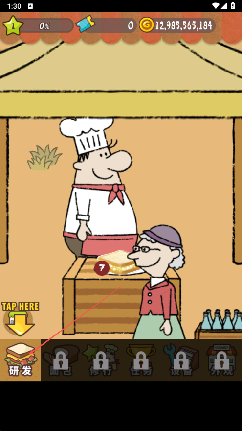 4、積累一定金幣后,點(diǎn)擊左下角研發(fā)按鈕,解鎖新的菜品或升級(jí)店鋪設(shè)施。