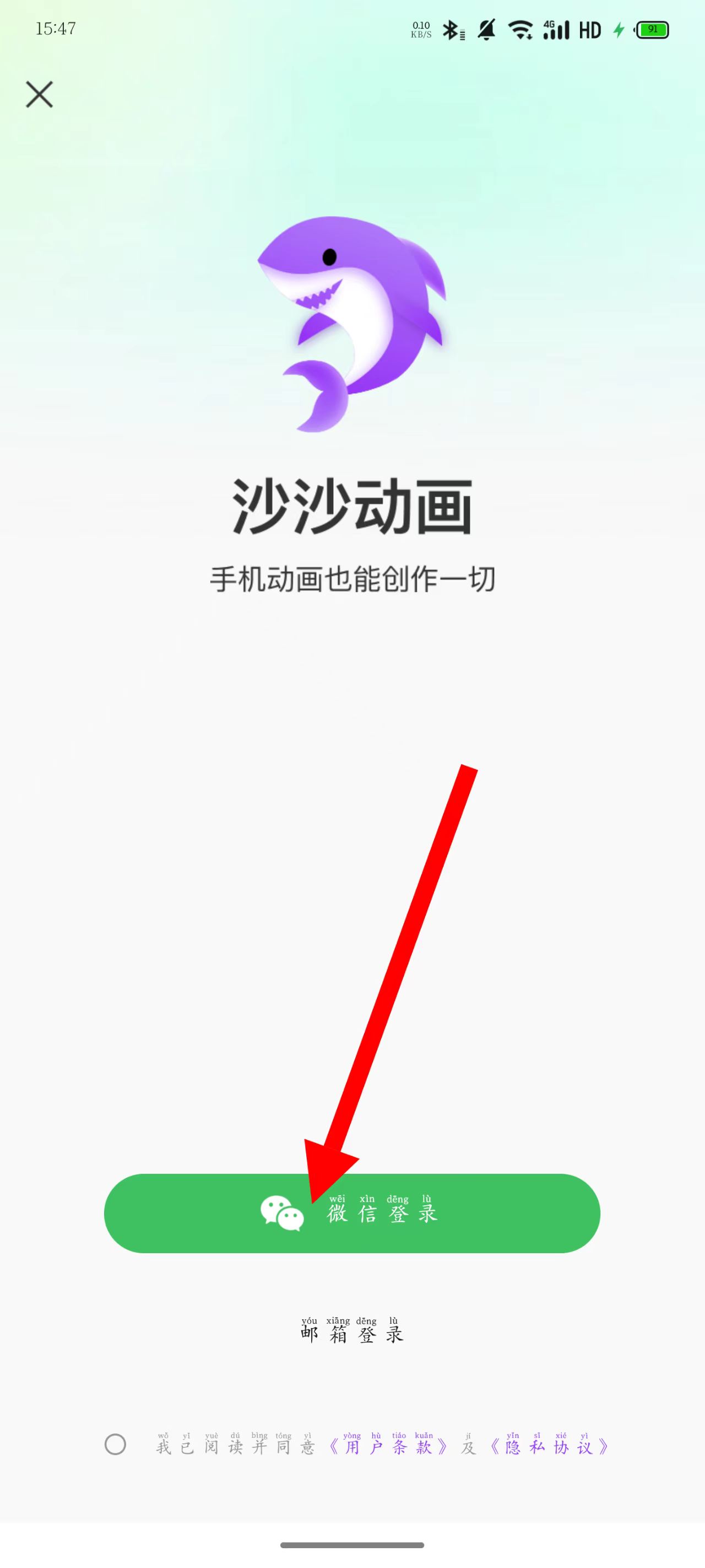 1、打開沙沙動(dòng)畫,點(diǎn)擊微信登錄按鈕完成登錄。