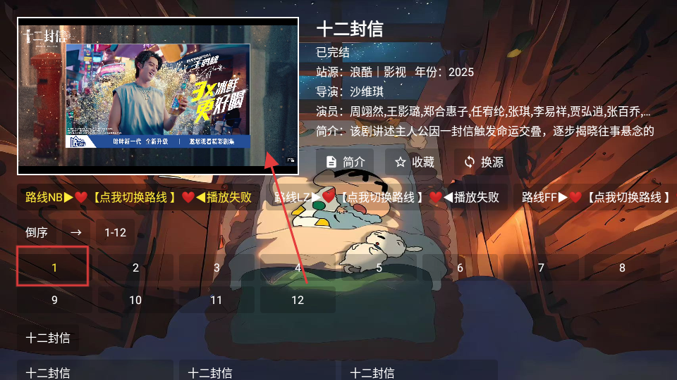 3、在十二封信播放頁(yè)面,選擇第1集,點(diǎn)擊小屏即可放大。