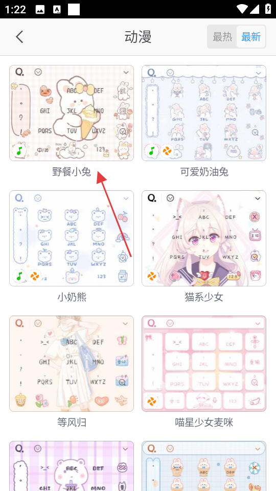 3、在動(dòng)漫皮膚列表里,點(diǎn)擊選擇野餐小兔皮膚。