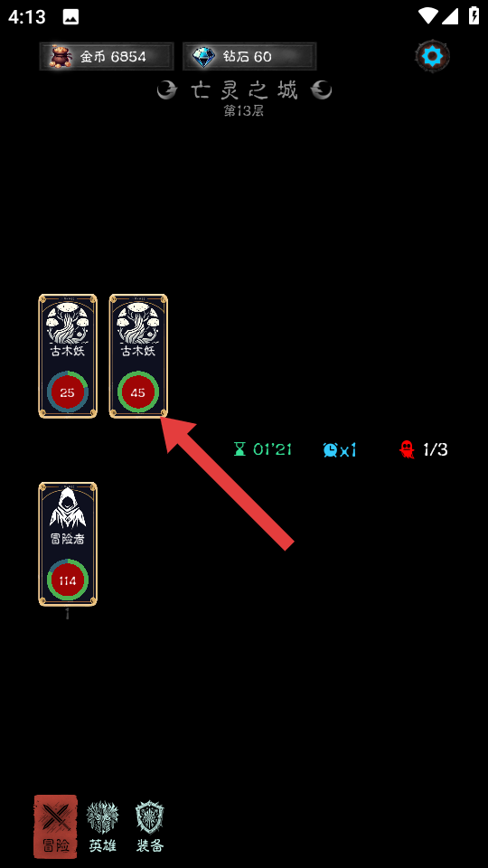 1、在亡靈之城第13層冒險時,遇到箭頭指向的古木妖敵人,可選擇與其戰(zhàn)斗,擊敗敵人獲取經驗,推進地牢探索。