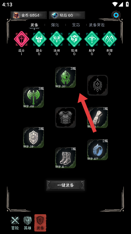2、進入裝備界面,看到箭頭指向的裝備如3級頭盔,可點擊查看裝備屬性,考慮是否為角色更換該裝備,提升角色戰(zhàn)力。