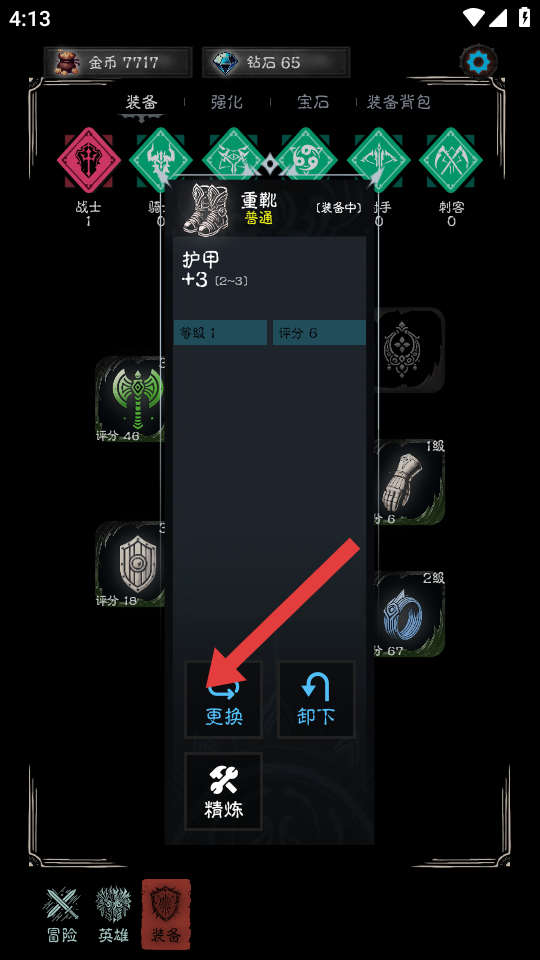3、在裝備詳情界面,若當前裝備如重靴需要更換,點擊箭頭指向的更換按鈕,可選擇其他更合適的裝備為角色的配備。