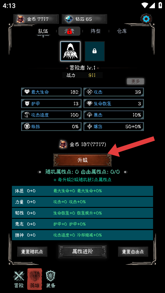 4、在英雄界面,點擊箭頭指向的升級按鈕,消耗金幣為冒險者角色升級,提升角色等級,增強角色在冒險中戰(zhàn)斗能力。