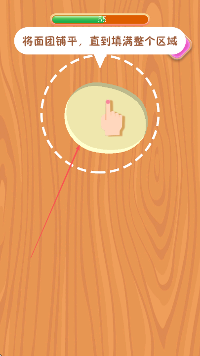 1、首先按照提示,用手指滑動(dòng)將面團(tuán)鋪平,填滿指定區(qū)域,注意上方進(jìn)度條55,確保面團(tuán)鋪得均勻完整。