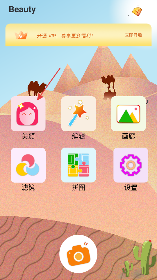 1、在美顏拍照相機(jī)首頁,點擊美顏按鈕,進(jìn)入選擇相冊頁面。