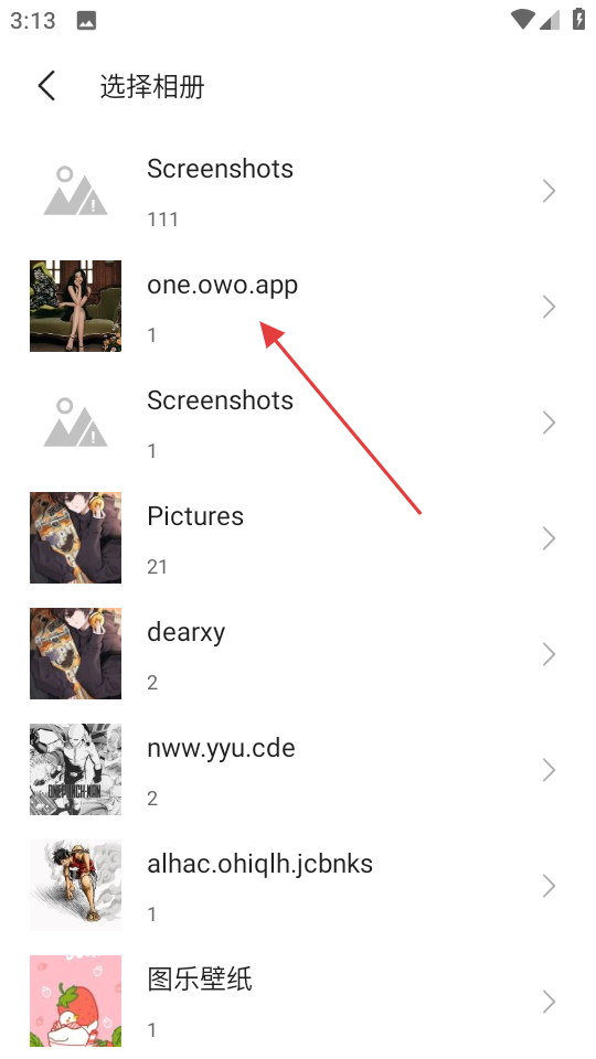 2、在選擇相冊頁面,點擊oneowoapp相冊,進(jìn)入該相冊圖片列表頁。
