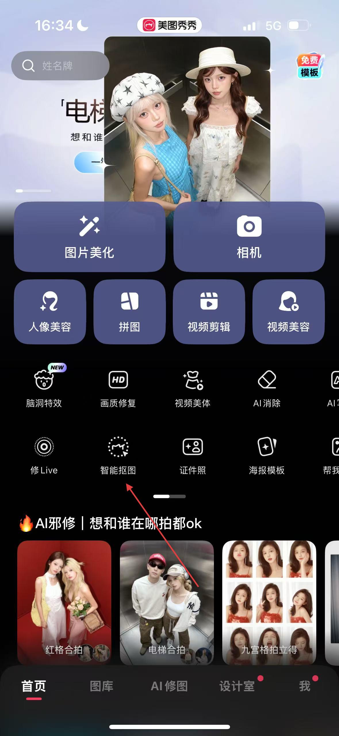 1、在美圖秀秀首頁,點(diǎn)擊智能摳圖,進(jìn)入圖片選擇頁面。