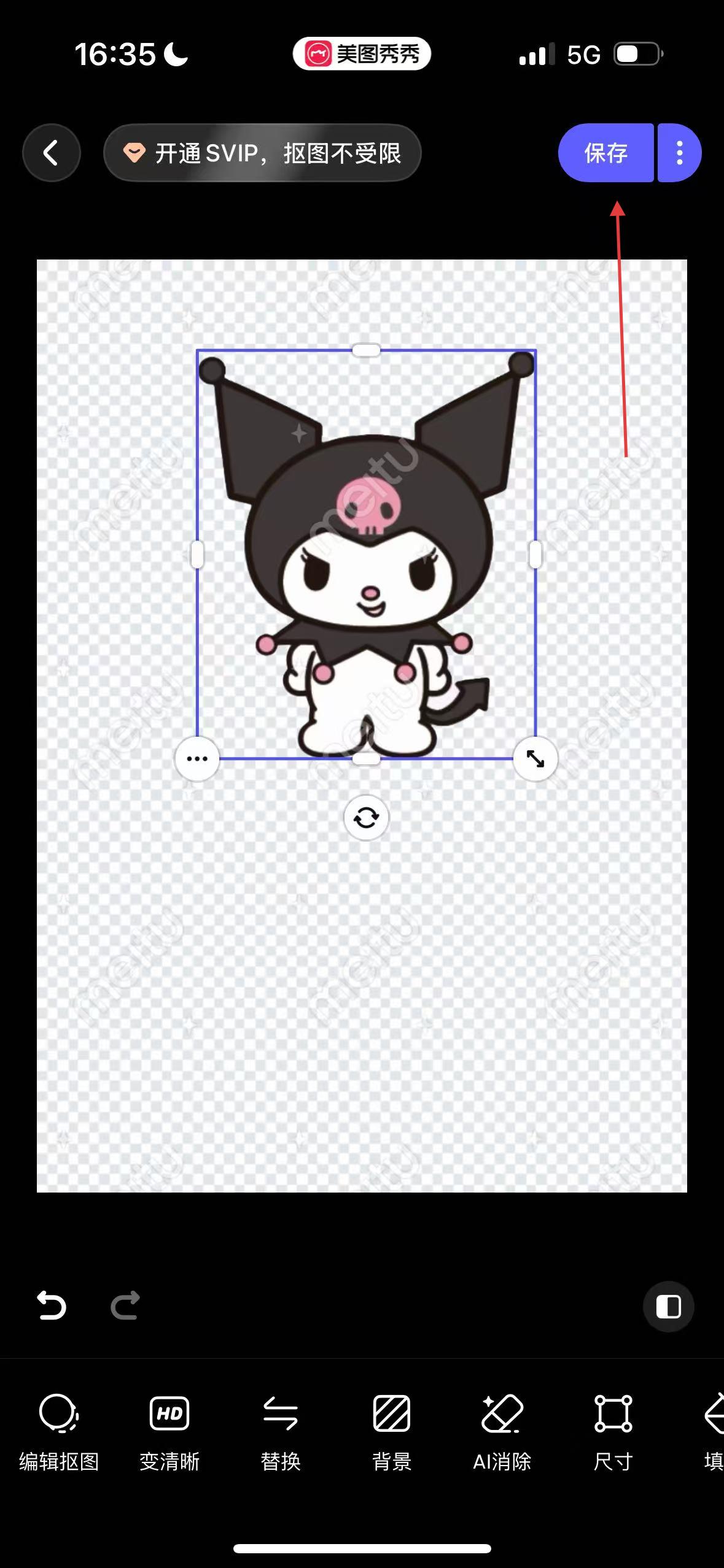 4、在摳圖完成頁面,點(diǎn)擊保存,即可保存摳圖后的圖片。