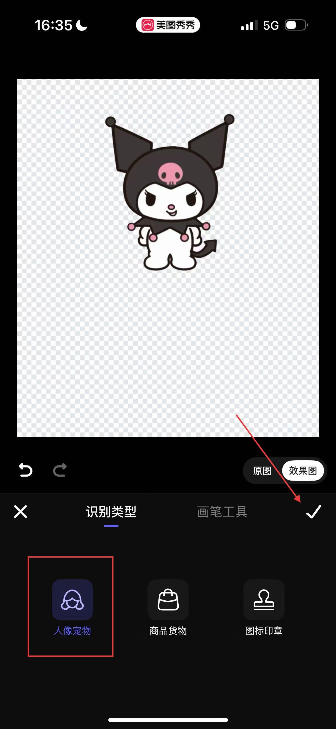 3、在摳圖編輯頁面,選擇識別類型如人像寵物,點(diǎn)擊對勾確認(rèn),進(jìn)入摳圖完成頁面。