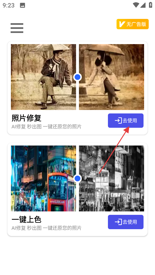 1、在首頁(yè),點(diǎn)擊照片修復(fù)旁的去使用按鈕,進(jìn)入全部圖片選擇頁(yè)面。