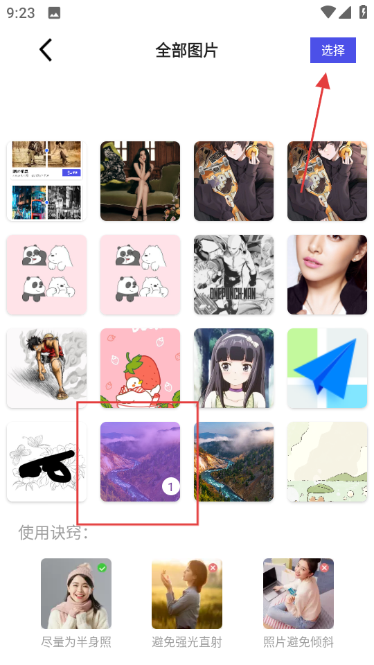 2、在全部圖片選擇頁(yè)面,選擇要修復(fù)的圖片,點(diǎn)擊選擇,進(jìn)入照片修復(fù)頁(yè)面。
