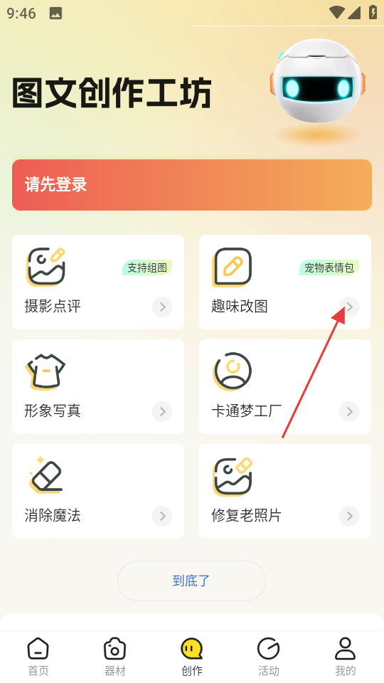2、在圖文創(chuàng)作工坊頁(yè)面,點(diǎn)擊趣味改圖,進(jìn)入趣味改圖頁(yè)面。