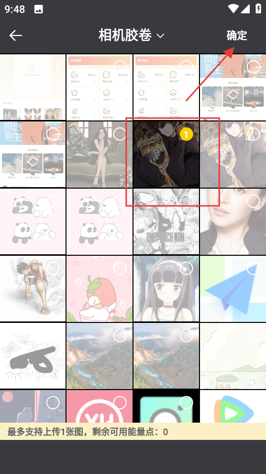 4、在相機(jī)膠卷選擇頁(yè)面,選擇要改圖的圖片,點(diǎn)擊確定,即可進(jìn)行趣味改圖操作。