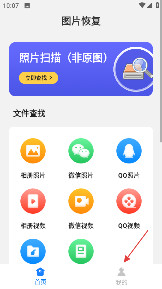 1、在圖片恢復(fù)首頁,點擊底部的我的按鈕,進(jìn)入個人頁面。