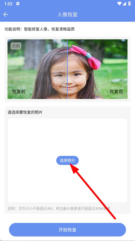 2、在人像恢復(fù)頁面,點(diǎn)擊選擇照片,選擇需要恢復(fù)的人像照片。