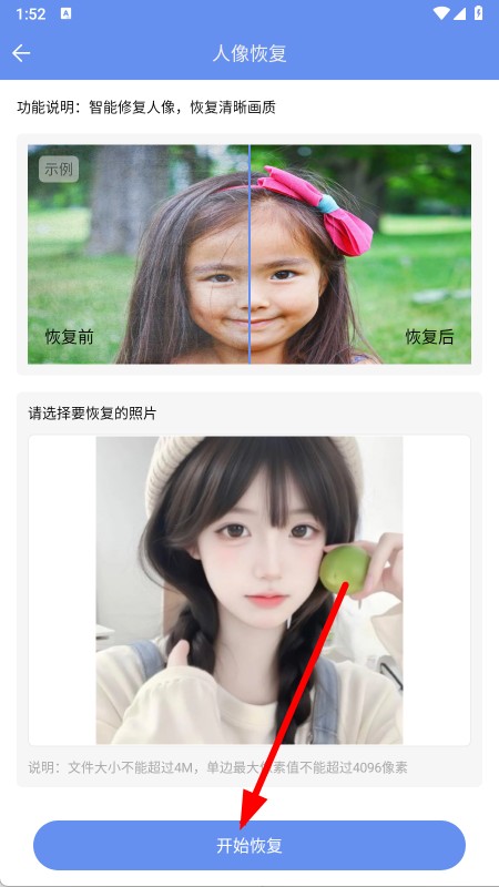 3、照片選擇完成后,點(diǎn)擊開始恢復(fù),將智能修復(fù)人像,恢復(fù)清晰畫質(zhì)。