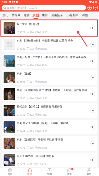 2、在分類欄中點(diǎn)擊京劇選項(xiàng),進(jìn)入京劇內(nèi)容列表。