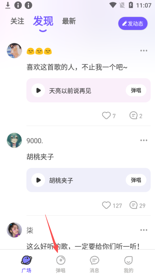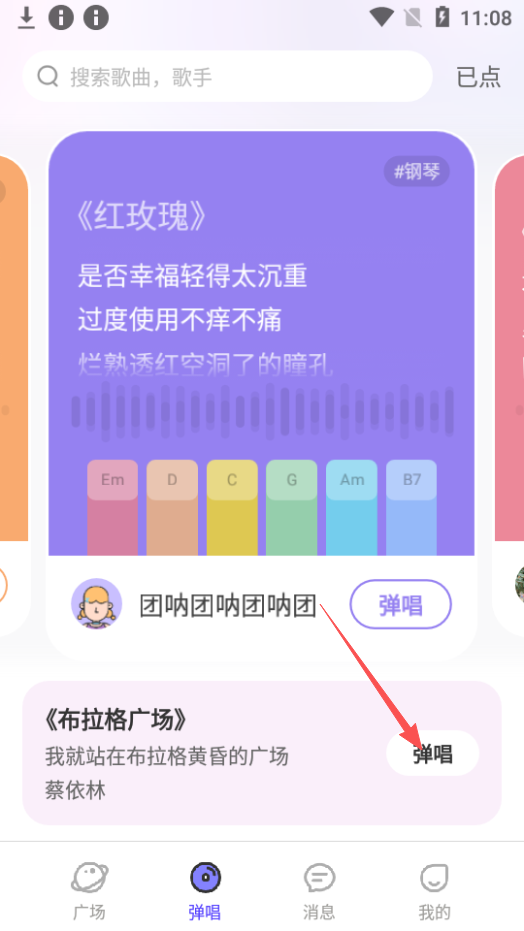 1、打開彈唱達人,在廣場頁面,點擊底部的彈唱,進入彈唱頁面。