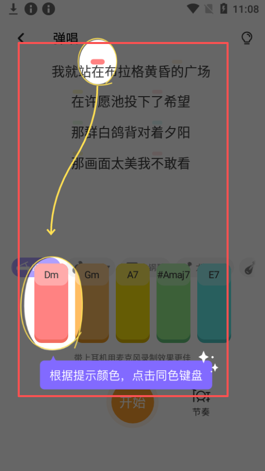 3、在歌曲彈唱準備頁面,根據(jù)提示,按照顏色點擊同色鍵盤,熟悉彈唱操作。